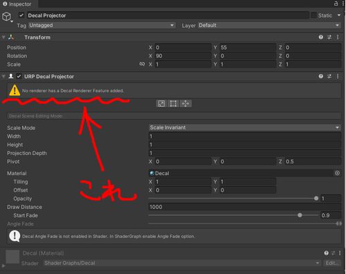 下記のように「URP Decal Projector」というコンポーネントに「No Renderer has a Decal Renderer Feature added.」と表示されてDecal処理ができない時の解決方法を記事にしました。 [ 解決方法 ] 「Assets」内にある「UniversalRenderPipelineAsset_Rendere…