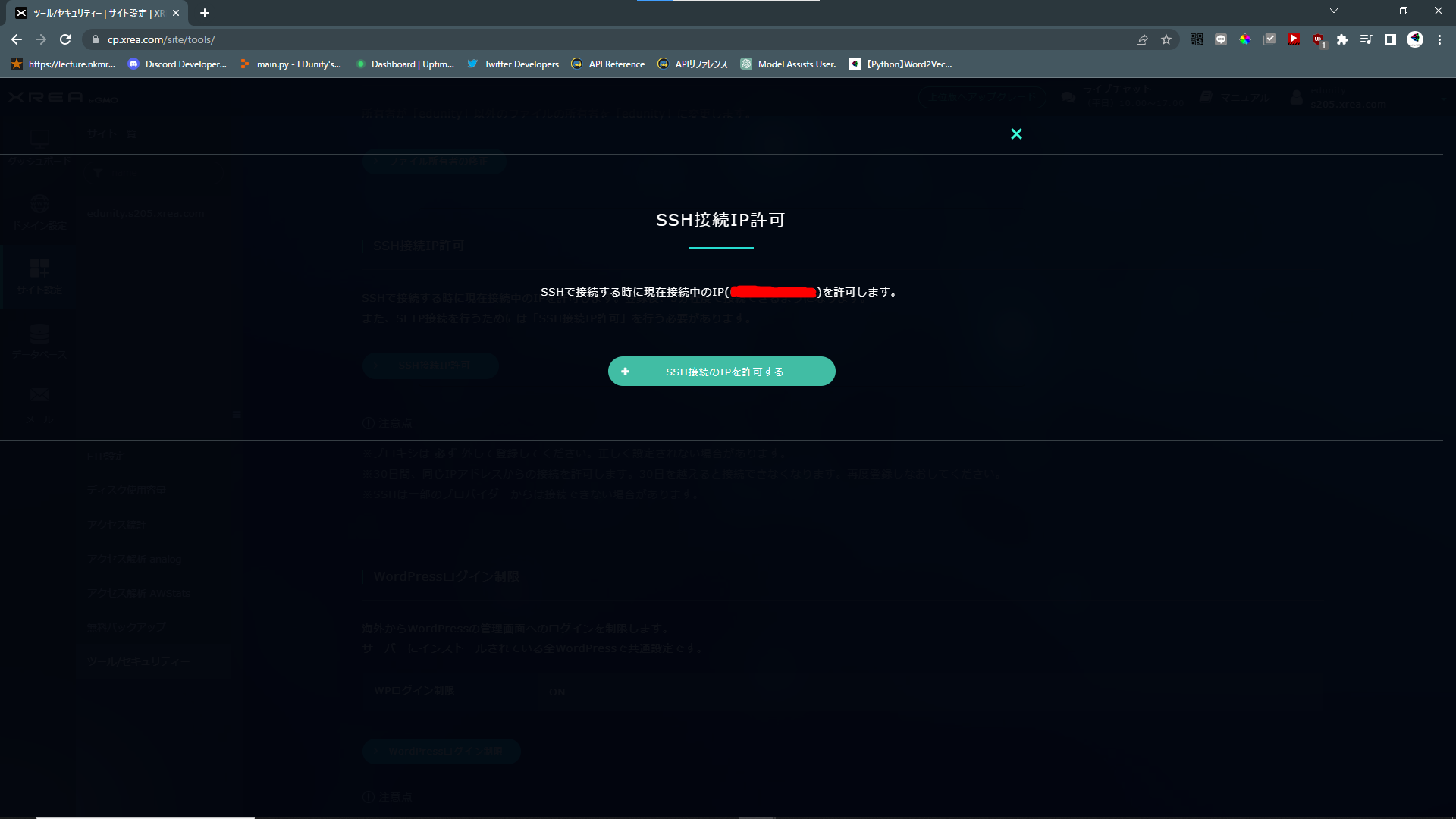「XREA」にログインして「サイト設定」の「ツール/セキュリティー」にある「SSH接続IP許可」をクリックします。